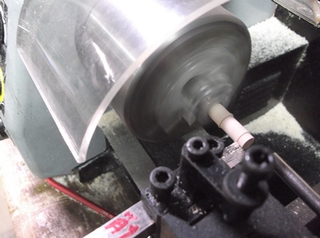 旋盤は木工専用の機械ではなく、依頼先からお借りした送り機構付きの小さな卓上旋盤である。